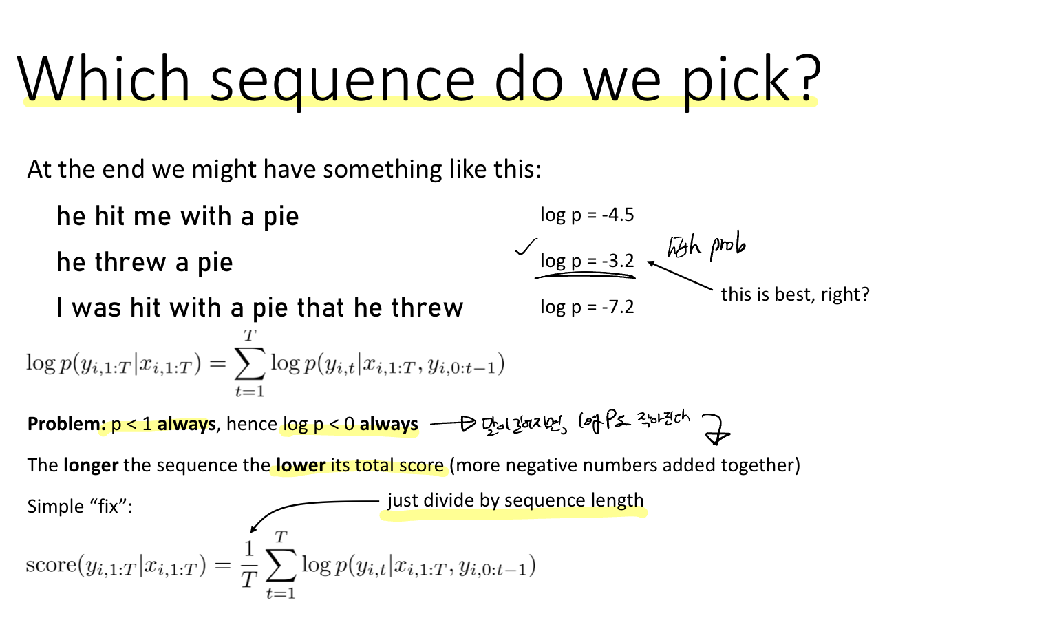 확률은 항상 1보다 작기 때문에 log(p)는 항상 0보다 작다. 따라서 시퀀스의 길이가 길어질수록 음수를 계속 더해가는 것이기 때문에 총 스코어는 작아진다. 이를 방지하기 위해 시퀀스의 길이로 나누어 준다.