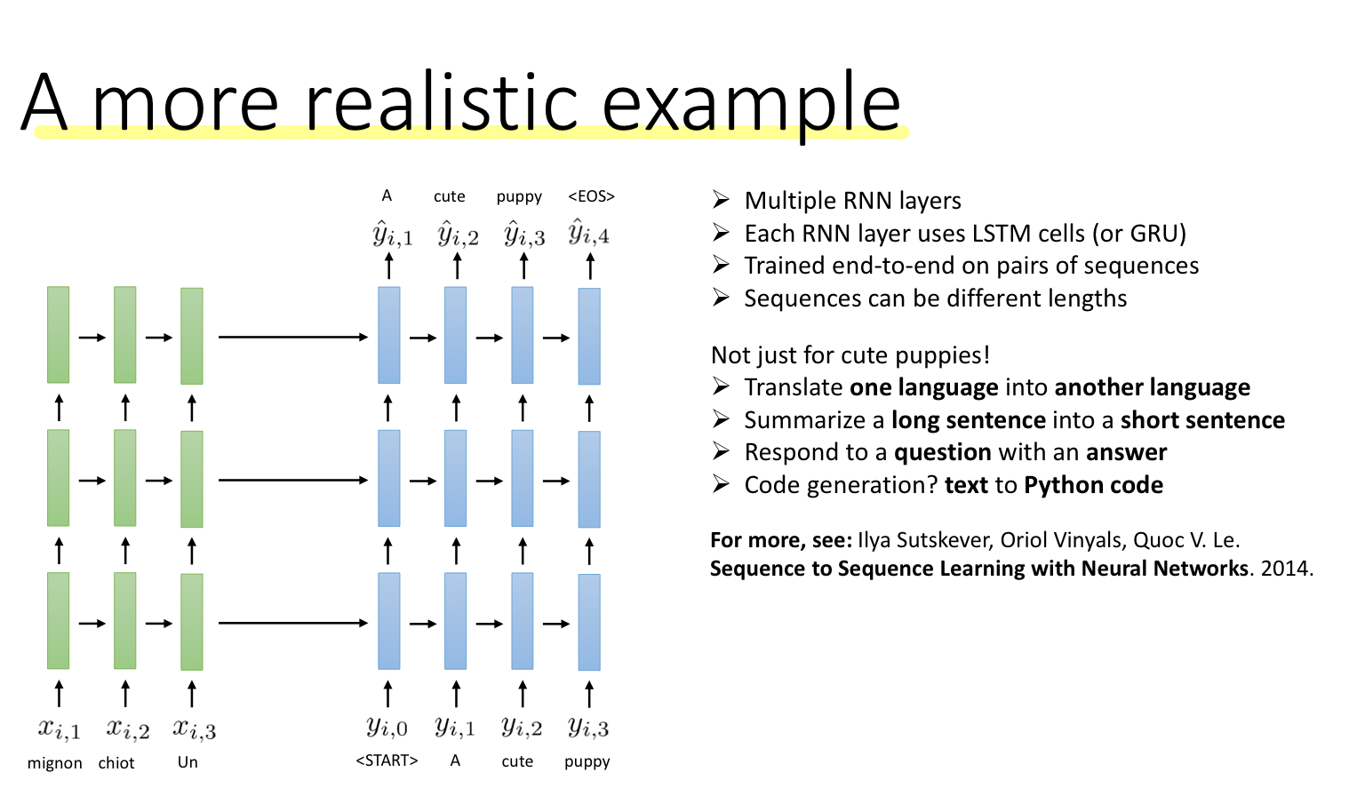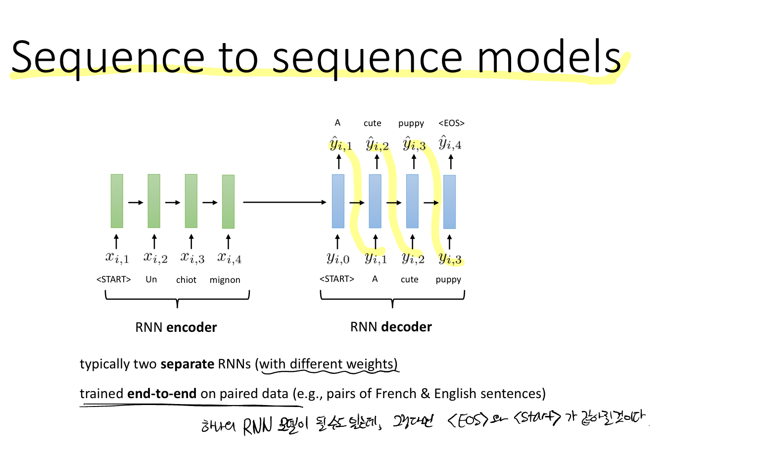 즉, 입력과 출력 시퀀스는 서로 다른 가중치를 사용하는 두 RNN 모델을 사용한다. 쌍을 이루는 데이터(예를 들어 프랑스어-영어)에 대해 엔트투엔드 학습한다.