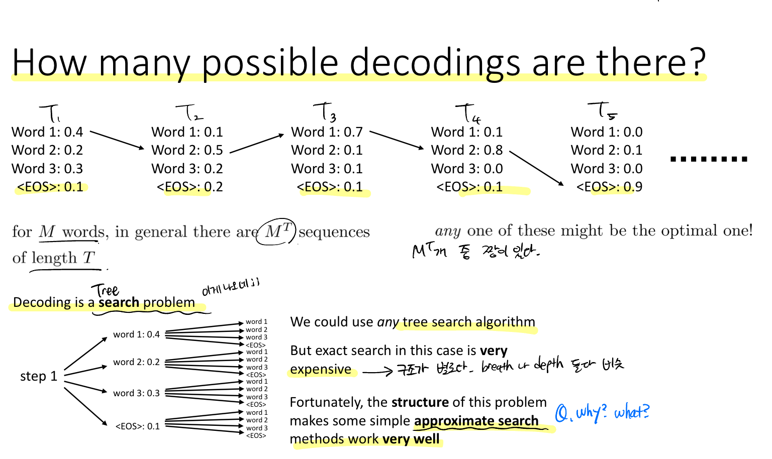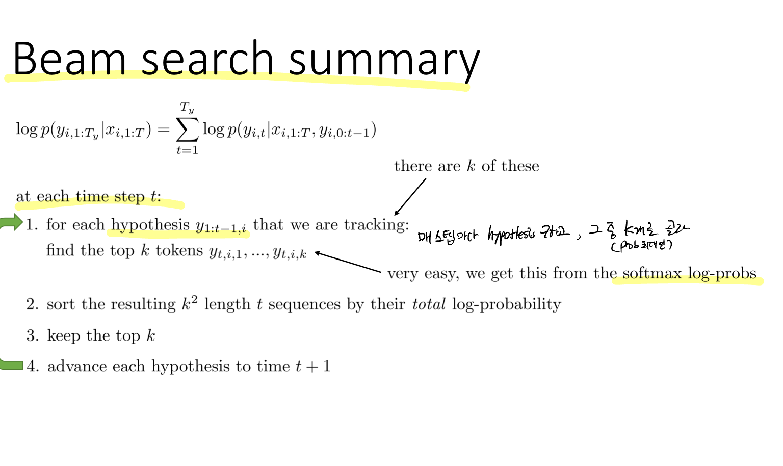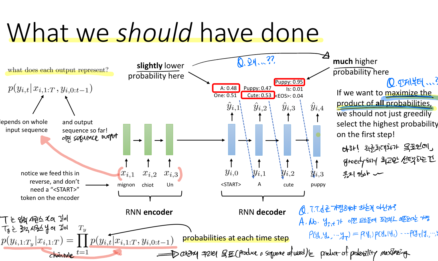결국 우리가 원하는 것은 높은 확률을 선택하는 것인데, 매 스텝(각 레이어)마다 최고의 확률을 선택하는 것(그리디한 선택)이 옳지 않다는 것이다. 이전 RNN에 대한 강의에서 이전 레이어의 출력이 다음 레이어의 입력으로 들어가는 것이 연속적인 데이터의 조건부 확률이라고 했었다. 따라서 우리의 목표함수는 하단에 나와있는 모든 확률의 곱이라고 볼 수 있다.