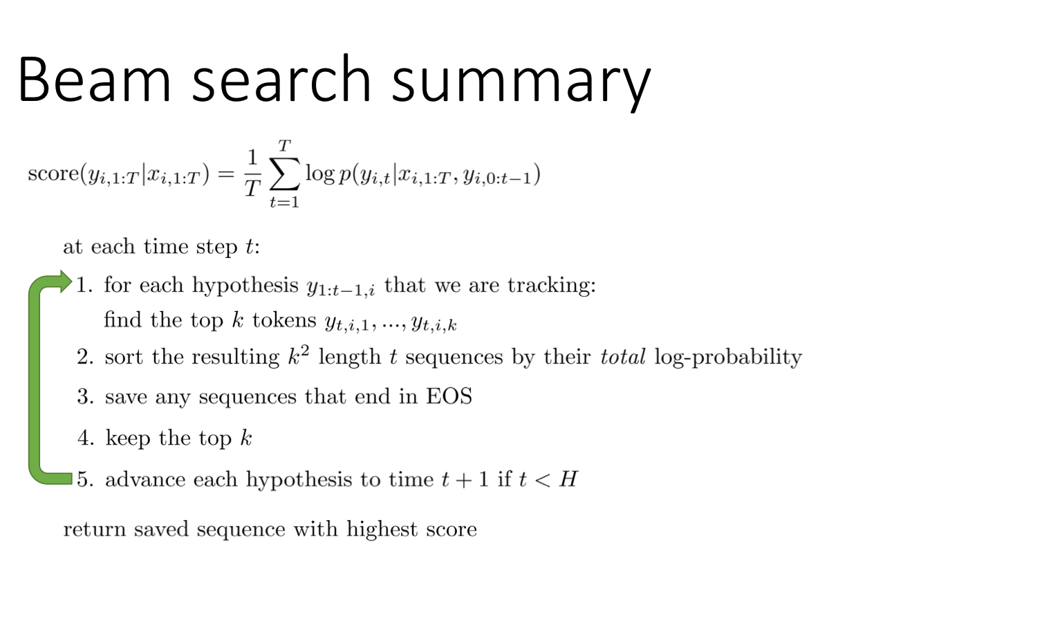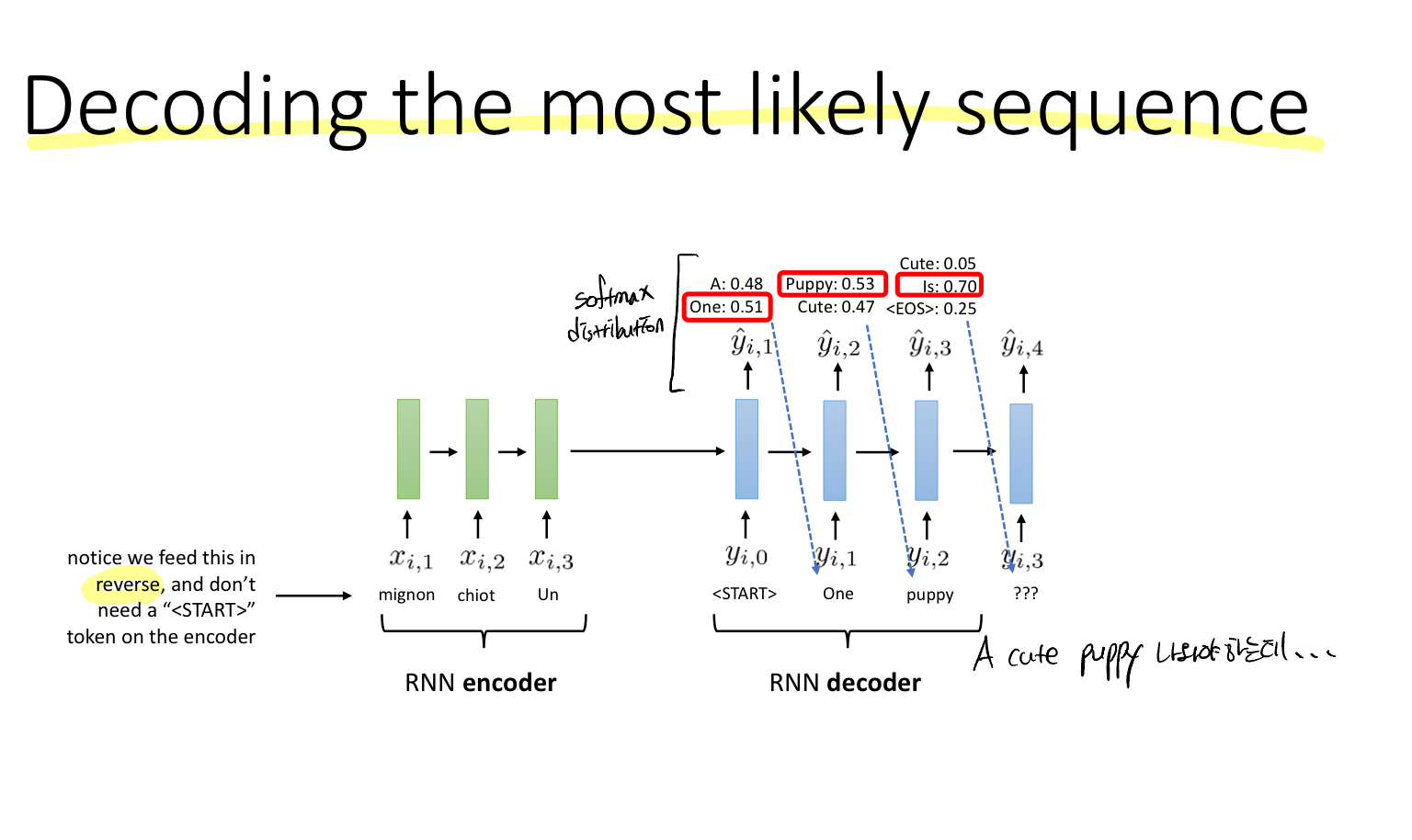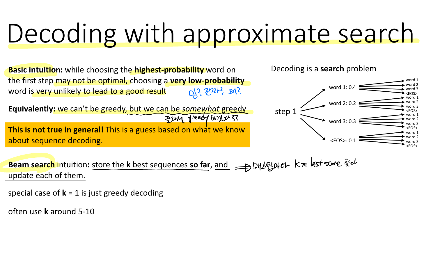 결국 우리가 원하는 것은 높은 확률을 선택하는 것인데, 매 스텝(각 레이어)마다 최고의 확률을 선택하는 것(그리디한 선택)이 옳지 않다는 것이다. 이전 RNN에 대한 강의에서 이전 레이어의 출력이 다음 레이어의 입력으로 들어가는 것이 연속적인 데이터의 조건부 확률이라고 했었다. 따라서 우리의 목표함수는 하단에 나와있는 모든 확률의 곱이라고 볼 수 있다.