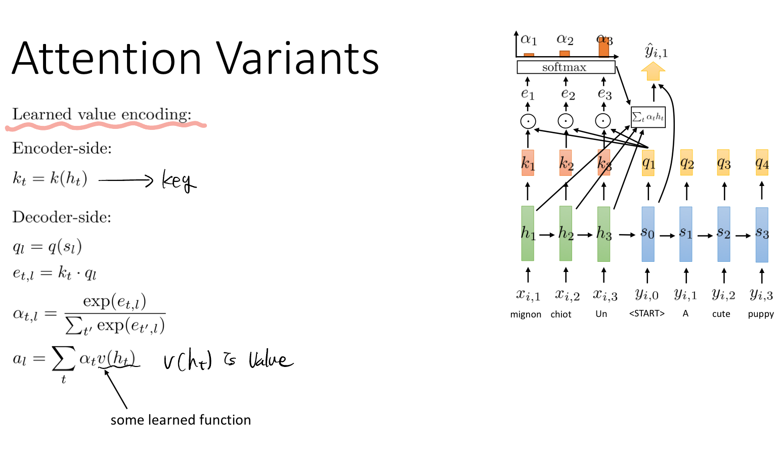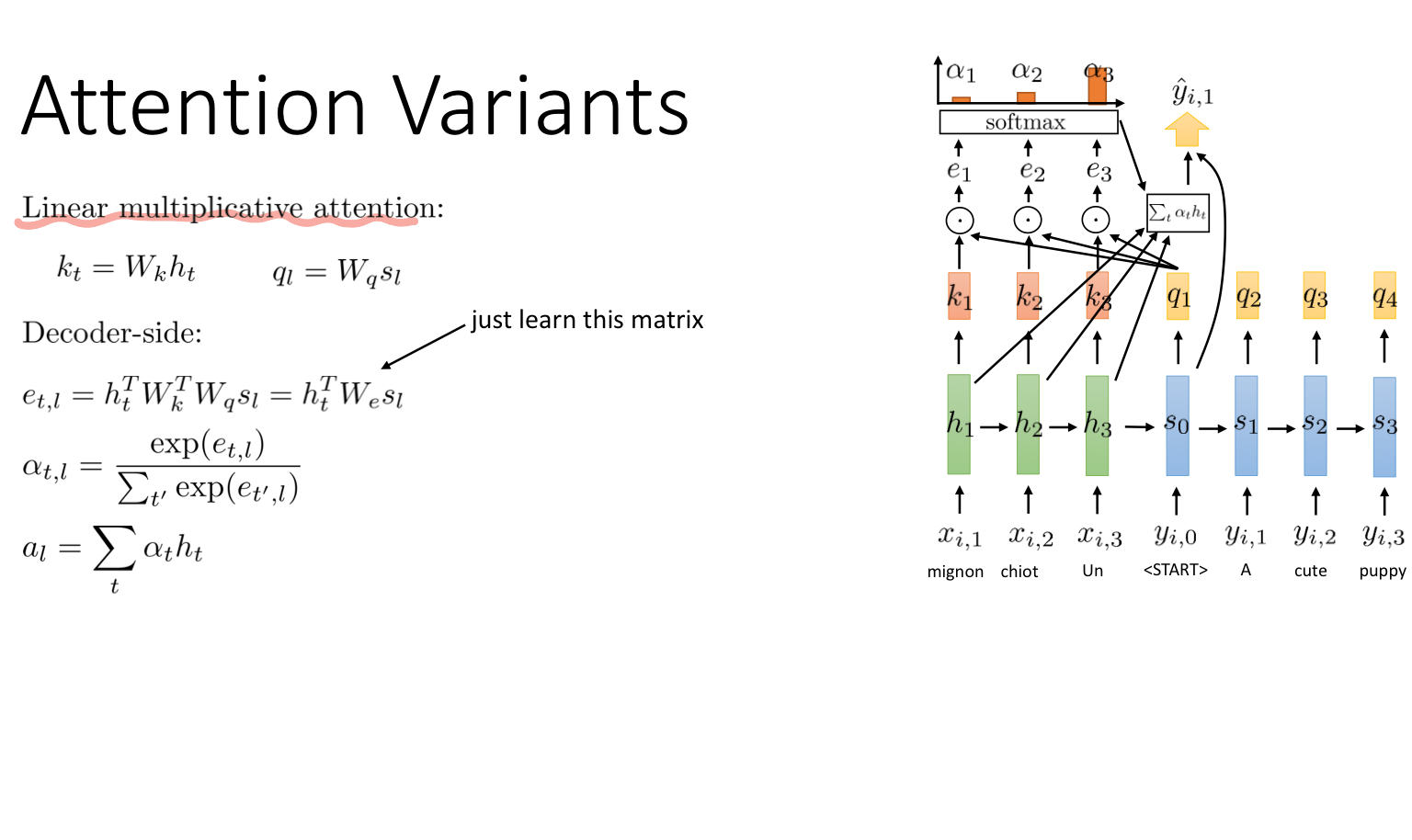 예를 들어, "귀여운 강아지"라는 말을 프랑스어(mignon chilot Un)에서 영어(A cute puppy)로 바꿀 때, 귀엽다라는 의미의 cute가 프랑스어로 무엇인지 비교하여 그 정보에 집중하겠다는 것이다.