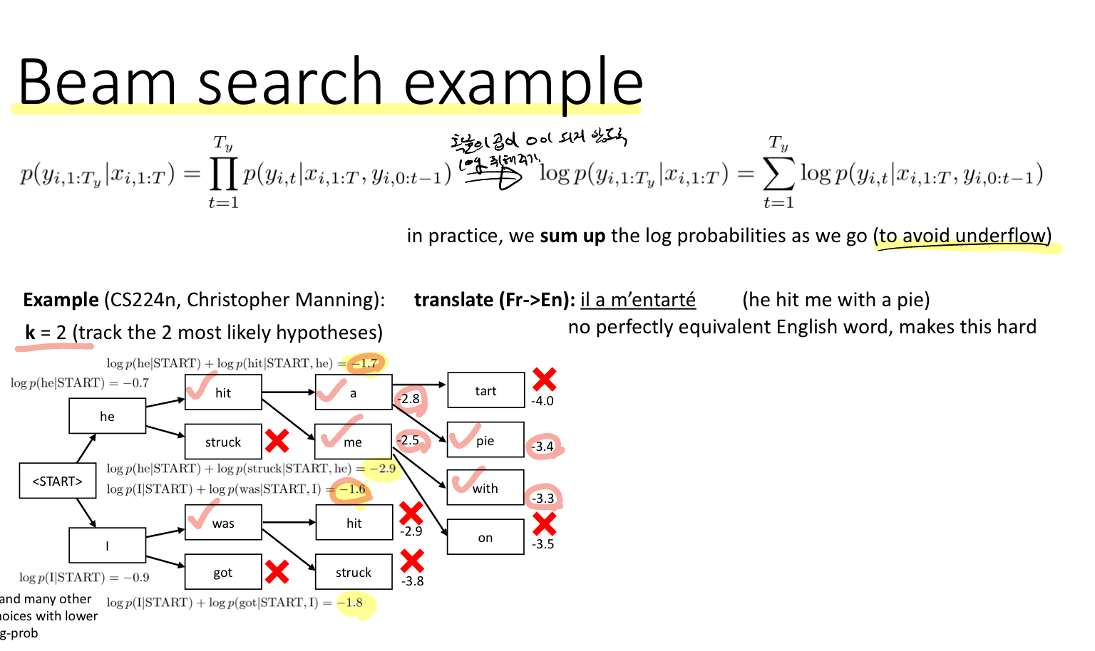 ML Basic에서 배웠듯이 확률의 곱은 0으로 수렴할 수 있기 때문에 log를 취해 표현한다. 이 방법을 이용해 프랑스어에서 영어로 번역하는 task에 대한 예시가 위에 주어져있다. 이때 K는 2로 두었다.