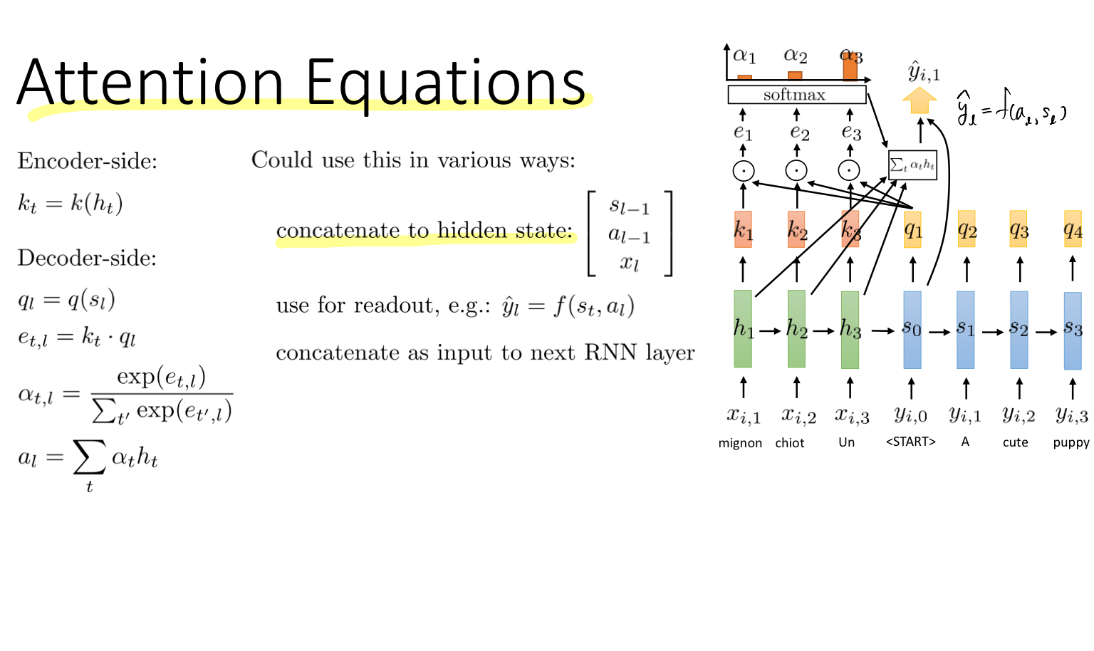 그리고 인코더 활성화의 가중치 합인 context vector는 디코더에서 관련된 입력 시퀀스의 정보를 통합하여 출력을 생성하는 데에 사용된다.