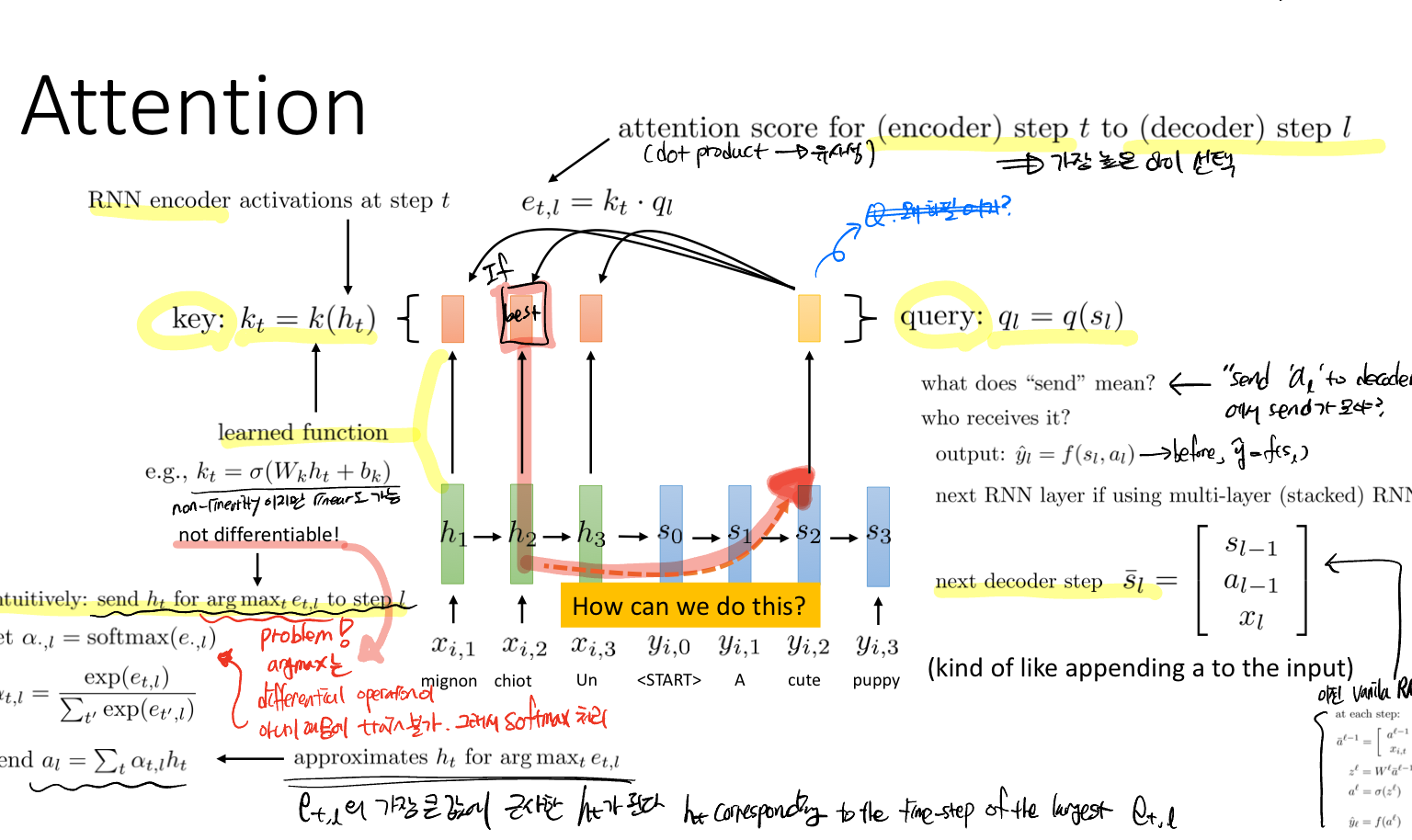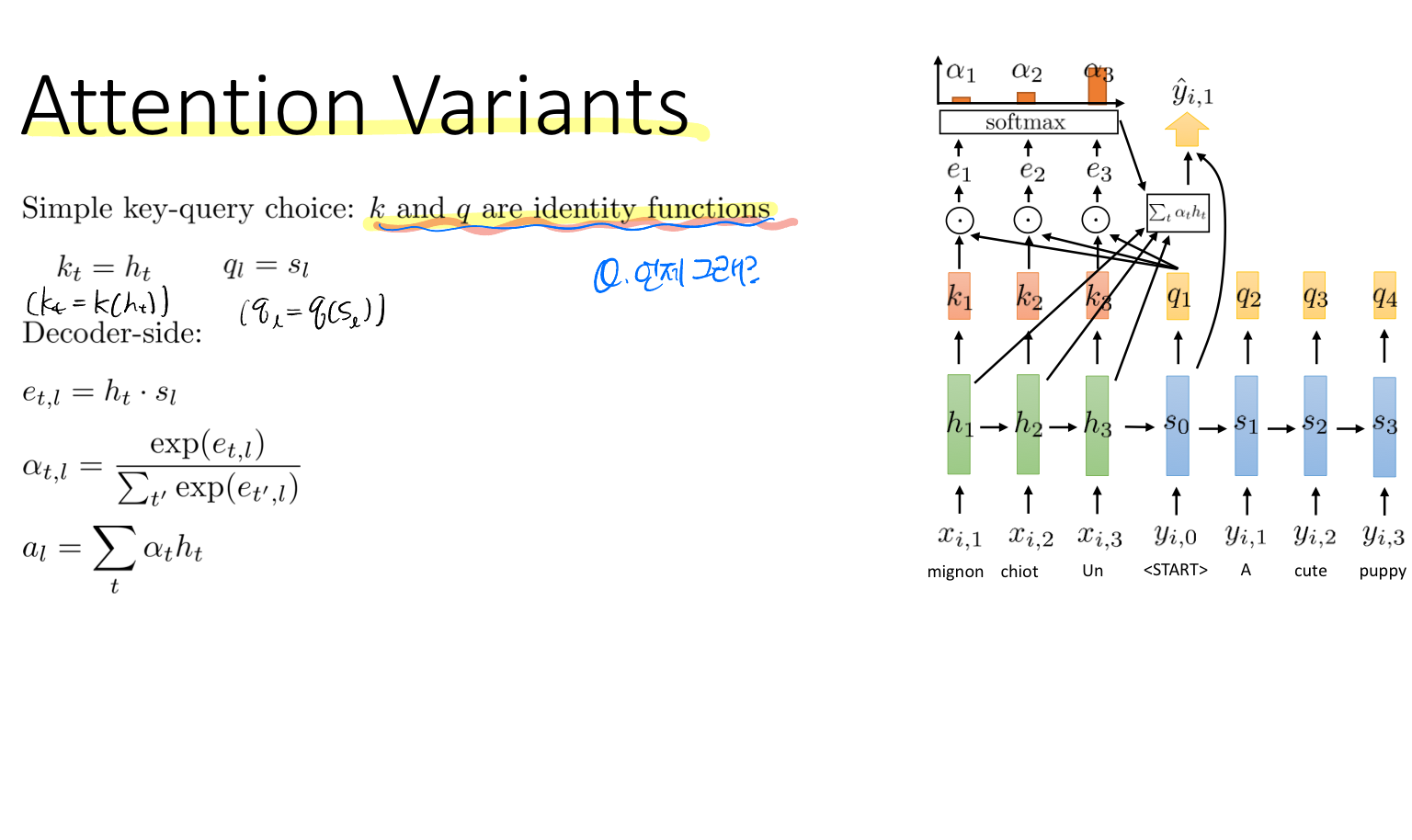 이때 Query와 Key라는 새로운 개념이 나온다. 쿼리는 출력 시퀀스에서 현재 단계에서 우리가 찾고자 하는 정보이고, 키는 입력 시퀀스의 각 단계의 정보 유형을 말한다.