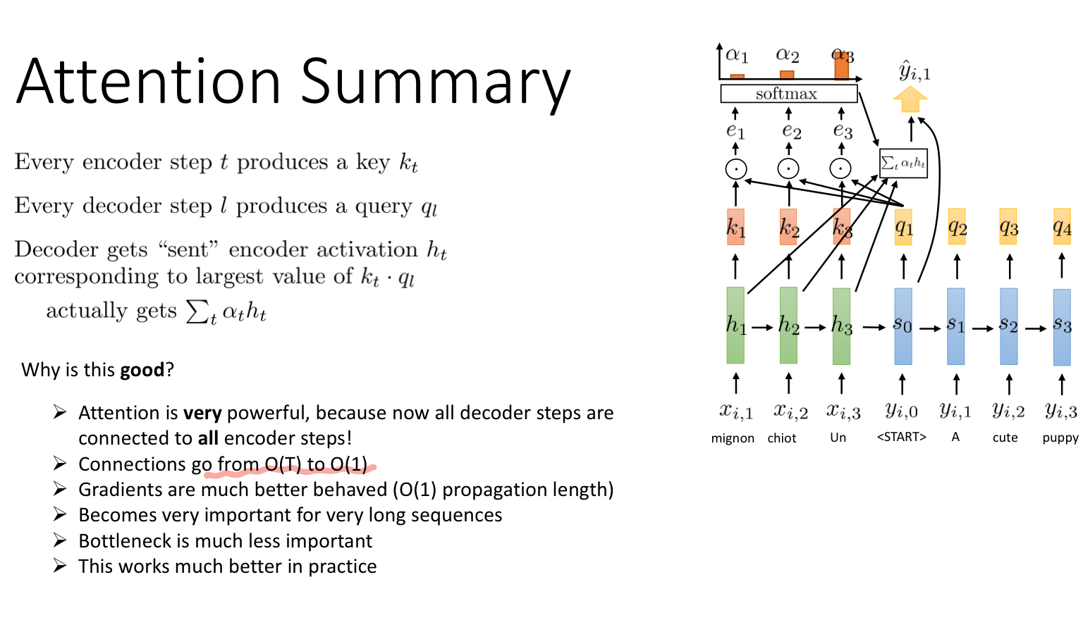 마지막으로 attention 연산이 효과적인 이유에 대한 내용이다. 어텐션의 디코더는 모든 인코더와 연결되어 있기 때문에 복잡성이 O(1)이 된다. 또한, 디코더와 인코더의 직접적인 연결 덕분에 gradient 정보를 잘 유지하고 학습할 수 있게 된다.