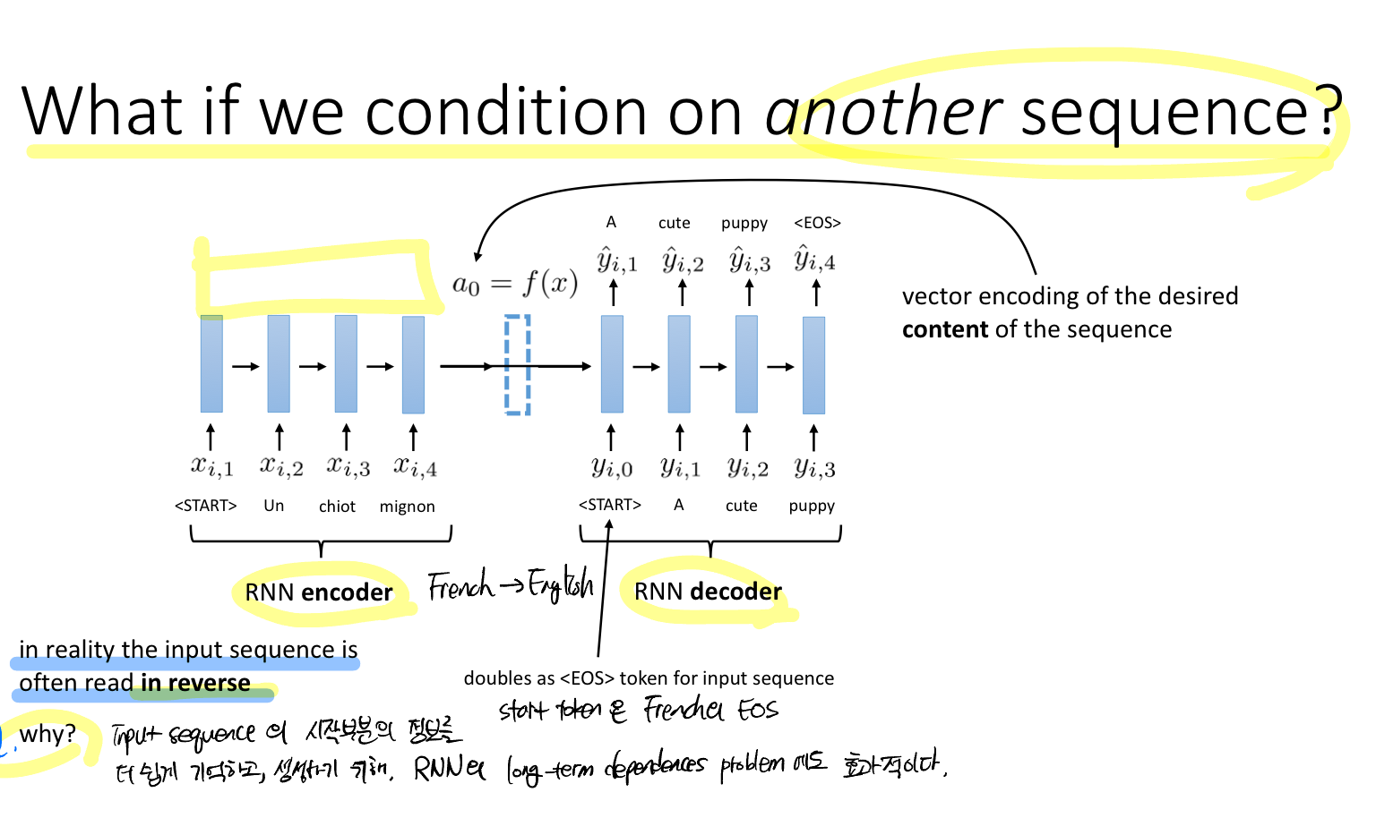 또한, 실제로는 입력 시퀀스를 종종 역순으로 사용하기도 한다고 한다. 이는 RNN 모델의 long-term dependences problem에 효과적이다.