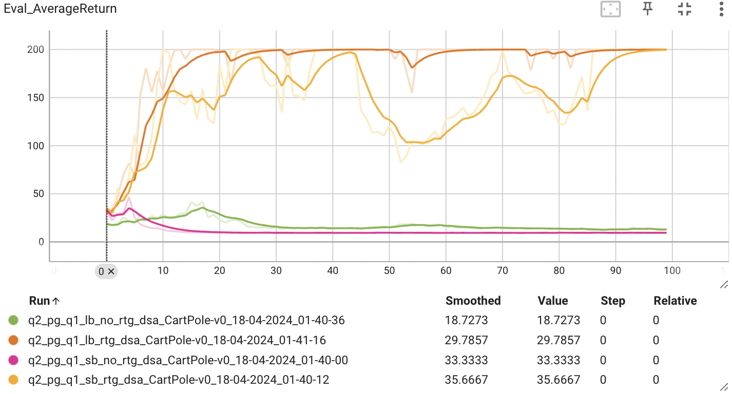 Discrete 환경 (CartPole-v0)에서 PG algorithms이 동작할 때 Batch_size의 크기, Advantage standardization, reward-to-go가 모델에 성능에 미치는 영향에 대해 분석해보는 것이 목표이다.