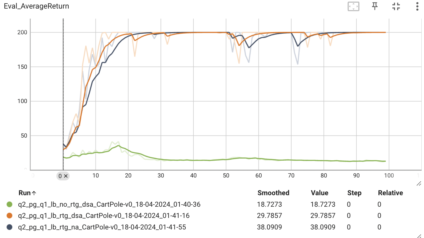 Advantage-standardization을 적용하지 않았을 때, reward-to-go를 사용한 추정기의 성능이 월등히 높은 것을 알 수 있다. reward-to-go는 action과 reward 사이의 causality 인과관계를 고려한 개념이다. 앞으로 얻을 모든 보상을 고려하는 것이 아니라, 에이전트가 현재 시점부터 미래에 얻을 보상에만 기반하여 정책을 업데이트하는 것입니다. 비슷한 개념이 Markov property가 있다. 마르코프 성질은 미래의 상태는 과거와 dependent하다는 것이다.