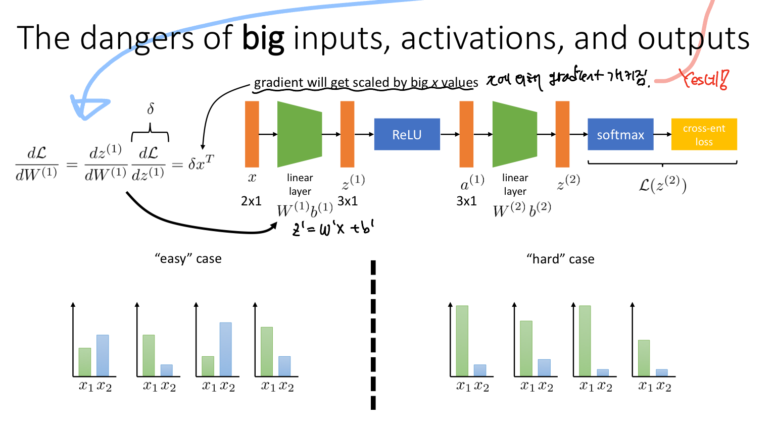 즉 advantage는 gradient의 input으로 들어가는 변수이다. 따라서 Backpropagation 과정에서 advantage는 gradient에 영향을 미치게 된다. 왜냐하면 "gradient will get scaled by big x values"이기 때문이다. 이는 이전에 수강했던 "CS182 UC Berkely Lecture7 - Getting Neural Nets to Train"에서 확인할 수 있다. 아래 사진은 해당 부분의 강의 노트이다.