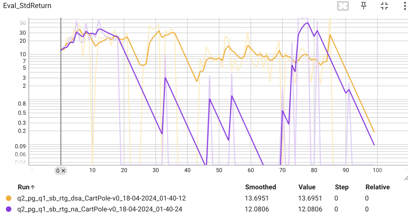위의 그래프는 배치 사이즈가 작은 경우, 보상의 표준편차를 나타낸다. 표준편차가 낮다면, estimator의 성능이 다양한 에피소드에서 일관된 성능을 보이고 있다는 의미로 볼 수 있다. 그래프에서 볼 수 있듯이 advantage-standarization을 적용했을 때 낮은 표준편차를 보이는 것을 확인할 수 있다.