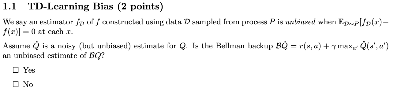 max 연산의 비선형성 때문에 BQ^는 BQ의 편향 없는 추정치가 될 수 없다. 따라서, BQ^는 BQ의 unbiased estimate가 아니다. 그래서 정답은 < NO >