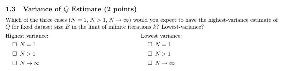 따라서, (N = 1)일 때 Q 추정치의 분산이 가장 크고, (N \rightarrow \infty)일 때 Q 추정치의 분산이 가장 작습니다.