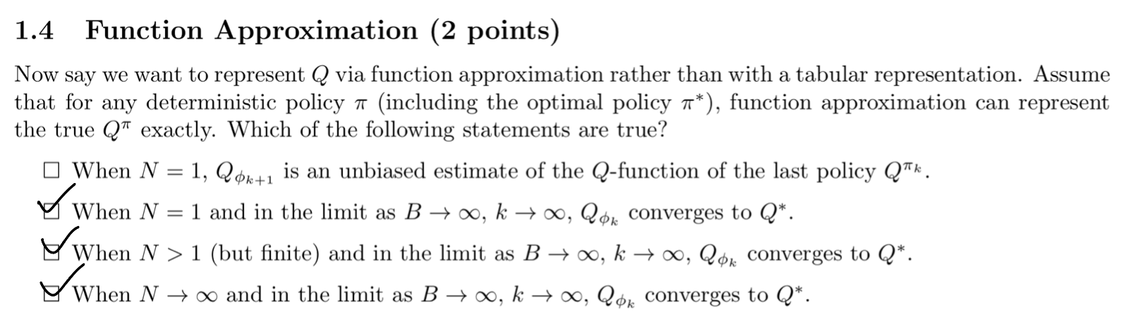 N이 무한대로 갈 때 Monte Carlo 방법과 유사하게 작동하며, 충분한 데이터와 반복 횟수가 주어지면 함수 근사는 최적 Q 함수 Q∗에 수렴할 수 있습니다. Monte Carlo 방법은 모든 보상을 직접 사용하는 방식이므로 편향이 없는 추정치를 제공합니다. 따라서 이 state도 옳습니다.