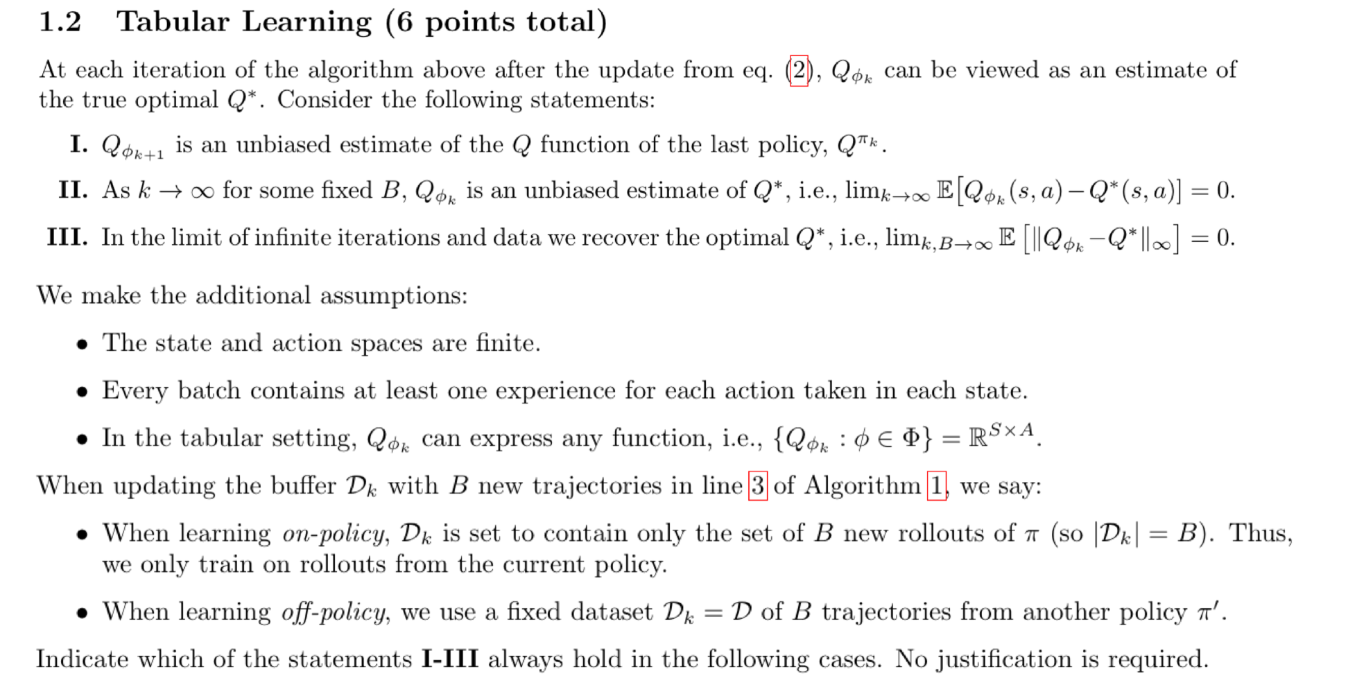 - 설명: On-policy 학습에서는 에이전트가 현재 학습 중인 정책 πk에 따라 데이터를 수집합니다. 따라서 수집된 데이터는 현재 정책에 대한 Q 함수의 unbiased estimate를 제공합니다. 반면, off-policy 학습에서는 다른 정책 π′로부터 데이터를 수집하므로, 학습 중인 정책과 일치하지 않아 bias가 생길 수 있습니다.