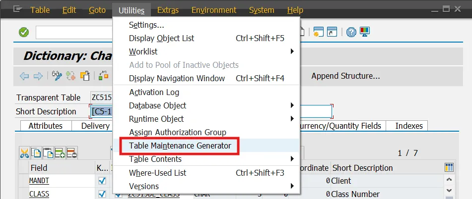 SE11 테이블 편집 화면 상단 Utilities → Table Maintenance Generator 클릭