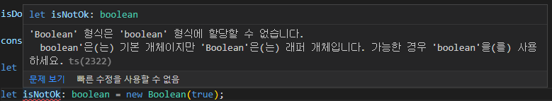 // let isNotOk: boolean = new Boolean(true); // 에러