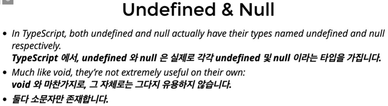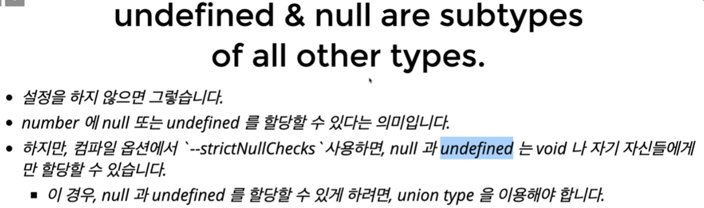 undefined 와 null 은 다른 모든 타입들의 하위타입으로 존재합니다.(설정을 하지 않으면..)