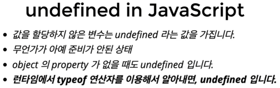 undefined타입을 가진 변수에는undefined값 이외에는 할 수 있는 것이 없습니다. 마찬가지로null이라는 타입을 가진 변수에도null말고는 할 수 있는것이 없습니다.