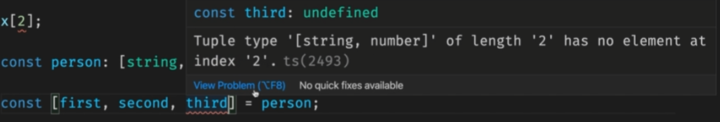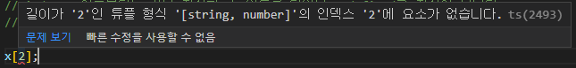 Tuple타입은 길이도 정해지기 때문에 위처럼 길이가 2인 Tuple 타입을 구조 분해 할당 으로 세번째 변수를 추가하면 Error를 발생시킵니다.