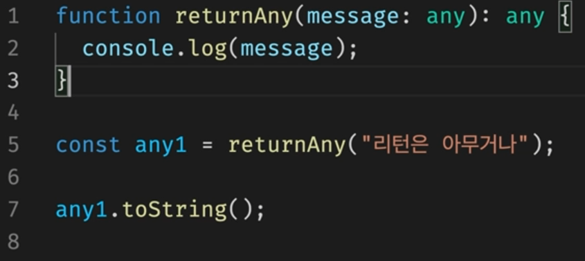 console.log만 출력하는 일을 하고 있습니다. 그래서 returnAny 매개변수에는 number타입이나 string 타입 등 다양한 타입들이 들어올 수 있는 함수입니다. 이런 message 매개변수는 정말로 any 타입일 수 있습니다.any 일 것이라고 추론합니다. 혹은 모른다고 판단합니다.