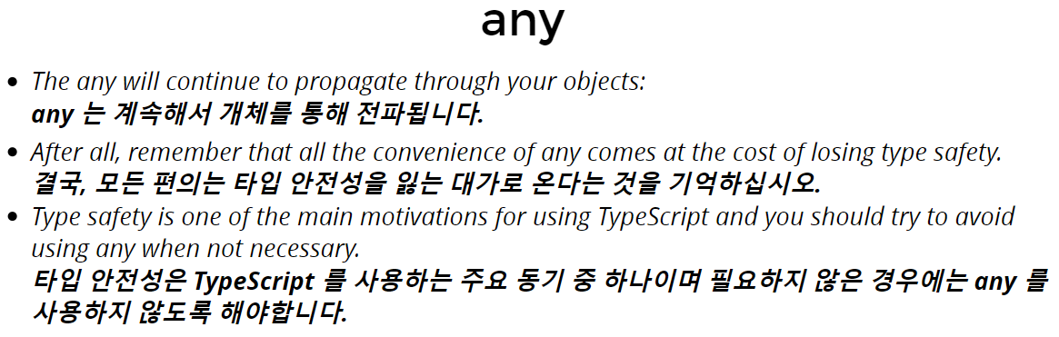 무심코 any를 남용하게 되면, 전체적인 타입 시스템에 문제가 발생할 수도 있습니다. 그래서 정확하게 알고 쓰는 것이 중요합니다.