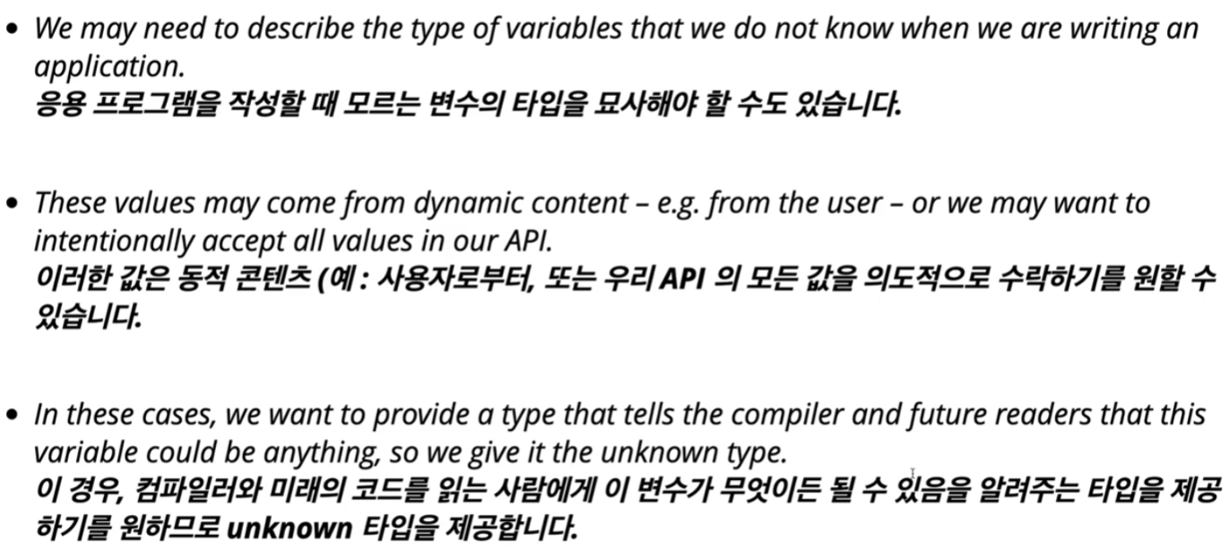 unknown 타입은 단어의 뜻과 동일하게 '알 수 없다, 모른다'라는 의미를 가집니다.