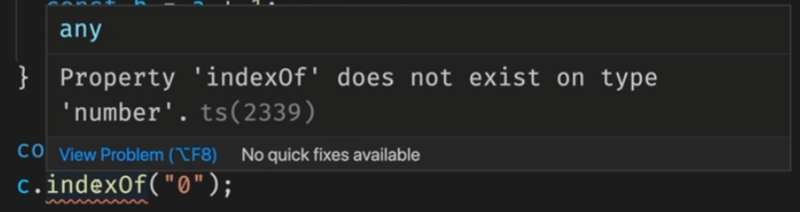 any타입이지만, .indexOf() 함수를 가지고 있지 않은 타입도 존재합니다. 예를 들어 c 에 string 이 온다면 더 함수는 동작하지만, number가 온다면 Error가 발생해야하는 상황입니다. 즉, any로 인해 명확하지 않습니다.우리는 위코드에서 누수를 막을 수 있습니다.