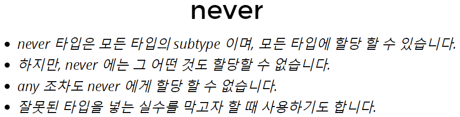 string과 number 타입에서 typeof를 통하여 number타입만 허용하는 상황을 만들었습니다.어떤 타입도 가지지 않는 빈 상태를 의미합니다.