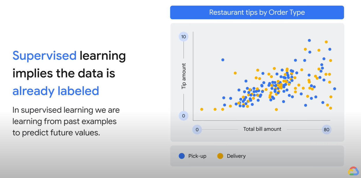In supervised learning, the model learns from past examples to predict future values, and in this case, tips. Here the Model uses the total bill amount to predict the future tip amount based on whether an order was picked up or delivered.