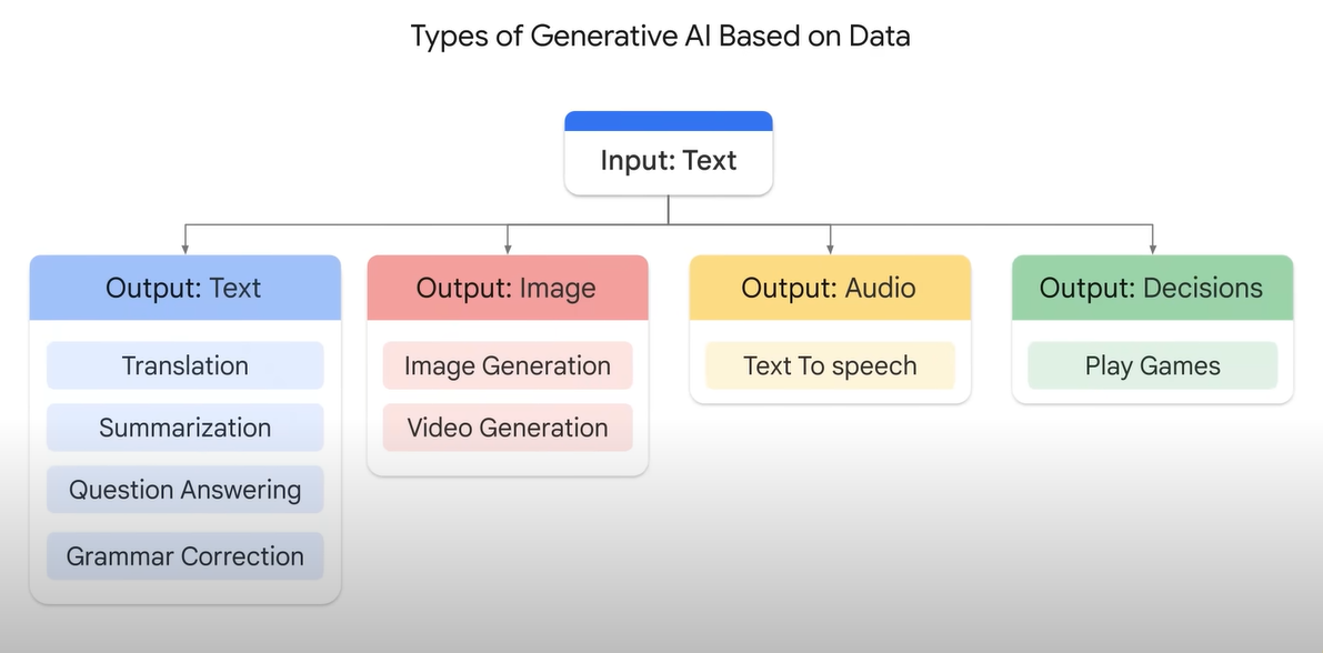A generative Text model takes text as input and can output more text an image, audio, or decisions.