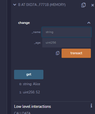 초기값은 Alice , 52로 스마트컨트랙 트랜잭션에 입력되어있다.
