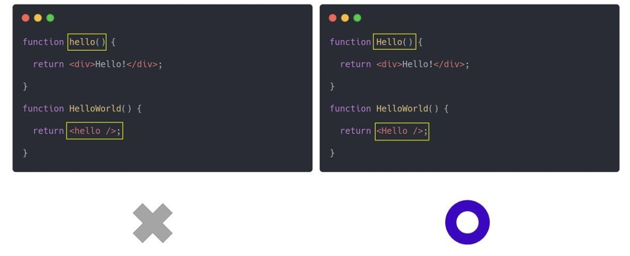 사용자 정의 컴포넌트는 대문자 로 시작해야 한다. 소문자로 시작하면 일반적인 html 엘리먼트로 인식한다.