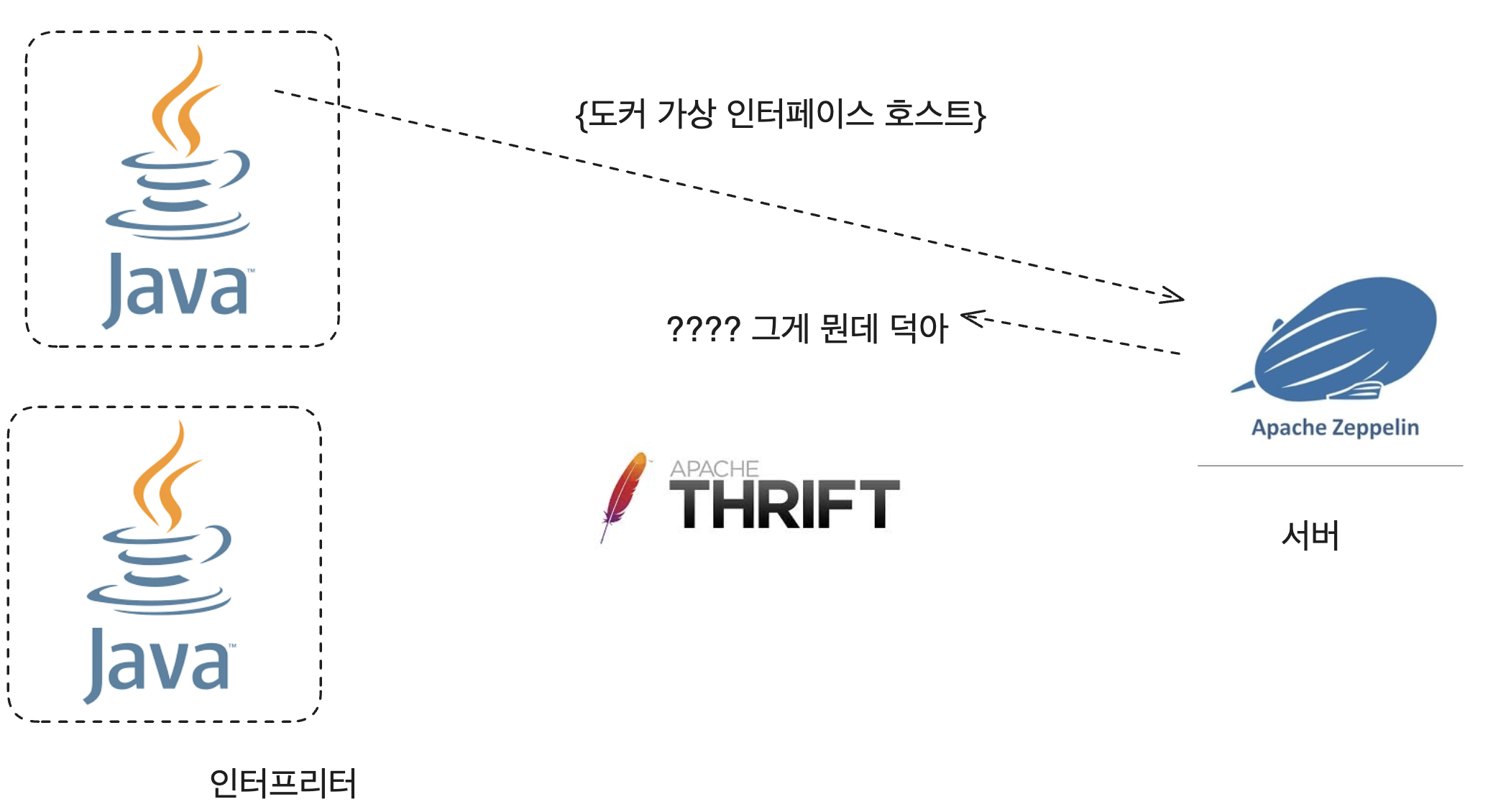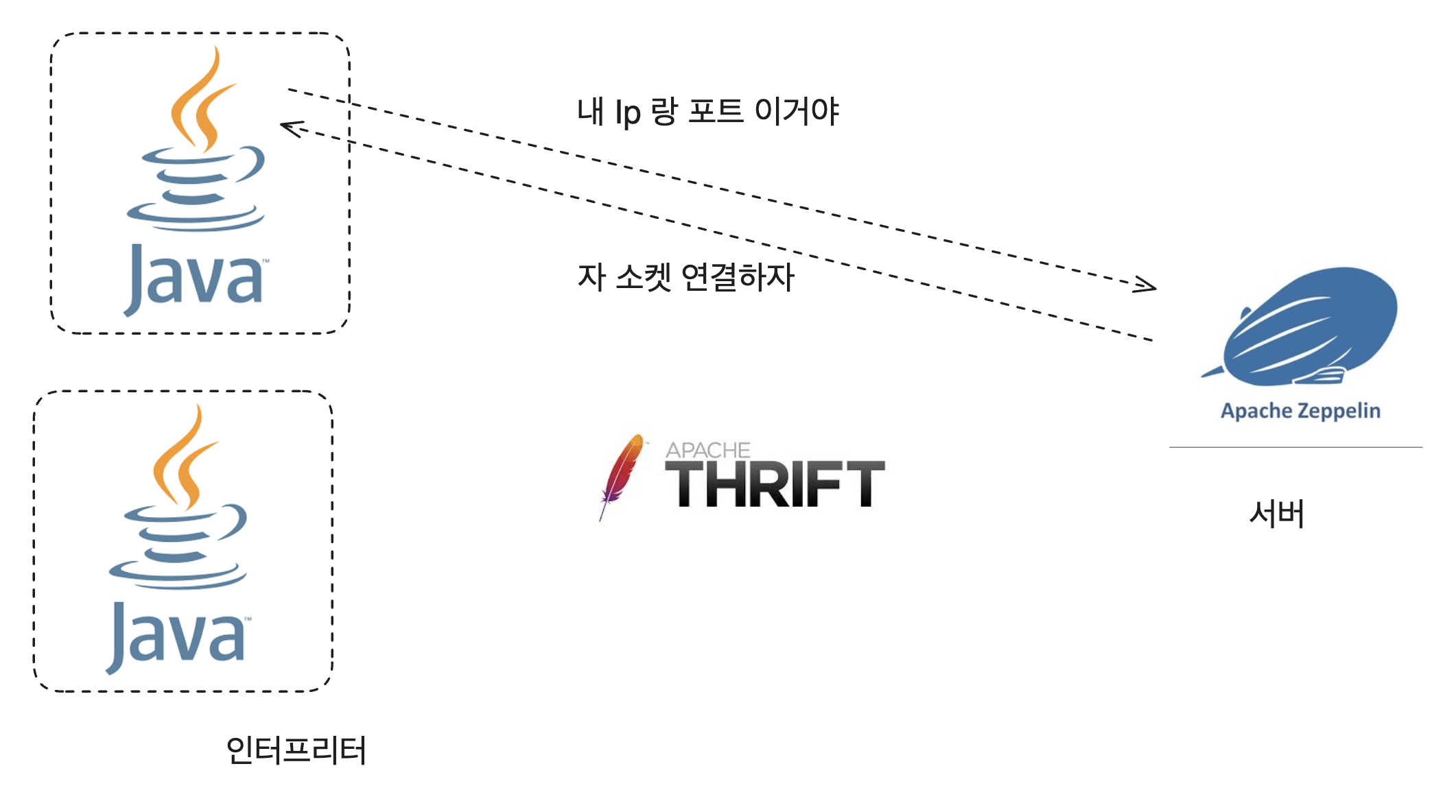 그 중 spark 인터프리터는 위와 같은 구조였는데, 인터프리터가 가능한 포트로 Apache Thrift 서버를 띄우고 이 호스트와 포트를 제플린 서버에 등록하는 방식이었다.(Apache Thrift 서버는 facebook에서 만든 멀티 언어 RPC 서버다)