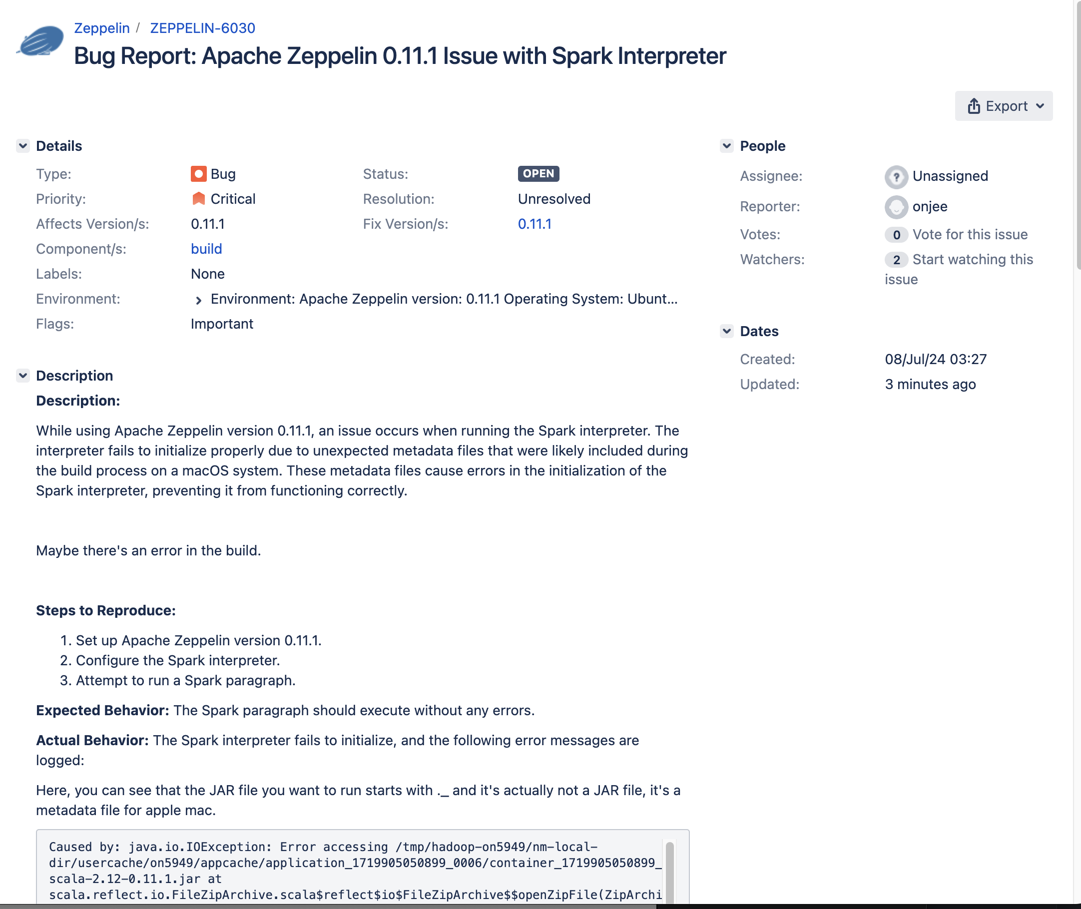 이러한 과정을 통해 버그를 찾게 되었고, Apache 재단에 가입해 jira로 버그를 리포팅 하였다. 또 Stack Overflow에 가서 문제를 겪는 사람에게 ._으로 시작하는 파일을 지우라고 조언을 해 주었다.