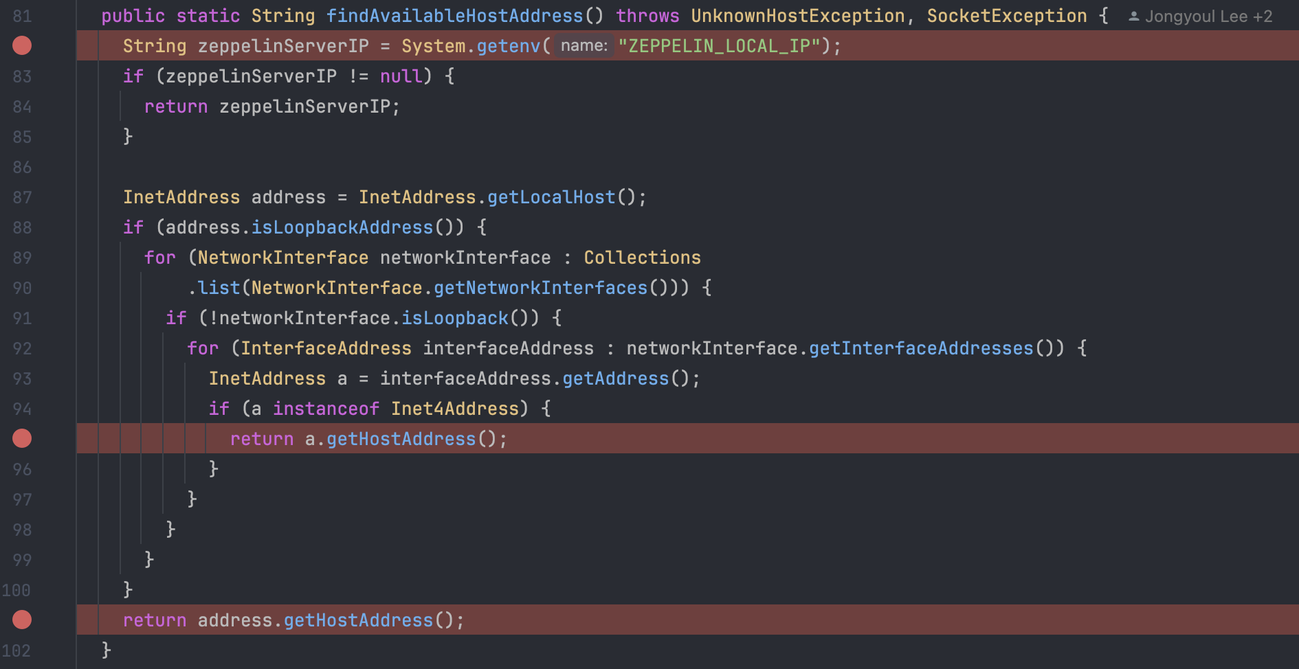이 메서드가 문제였는데, 보면 알겠지만, 가능한 네트워크 인터페이스 중에 루프백(로컬호스트)가 아닌 것 하나를 고르는 메서드 이다. 바로 이 호스트를 가지고 advertise(제플린 서버에 알려주는 것)하는 것이었다.