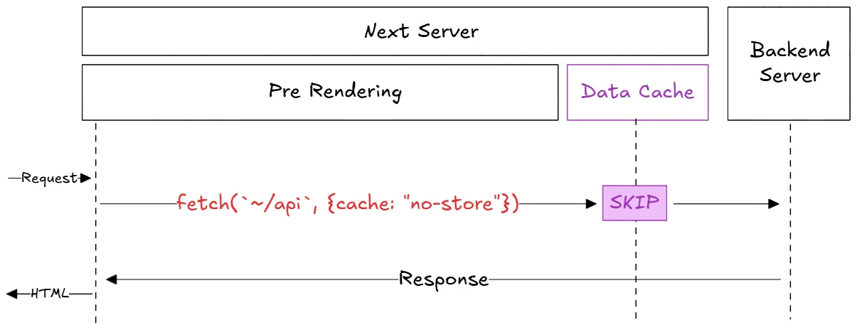 | "no-store" (default, Next v15 이상) | 데이터 페칭의 결과를 저장하지 않으며, 캐싱을 전혀 수행하지 않는다. |