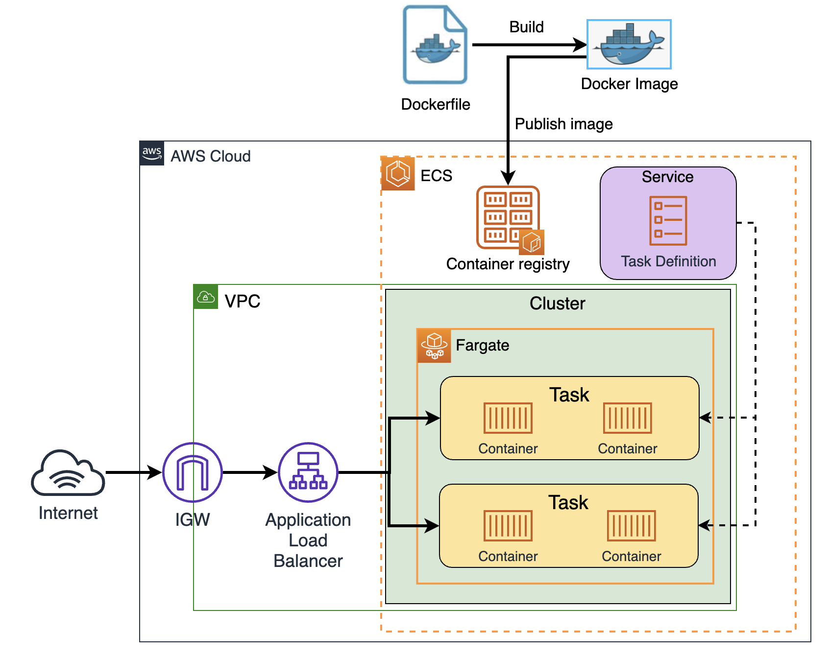 Dockerfile을 이용해 애플리케이션 코드를 컨테이너화된 Docker 이미지로 만듦Task Definition에 ECR에 저장된 이미지 경로를 지정한다. ECS 서비스는 이 정의를 바탕으로 ECR에서 해당 이미지를 가져와 Fargate 또는 EC2에서 컨테이너를 실행한다.