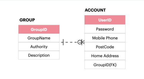 GROUP이 부모 테이블이고, ACCOUNT가 자식 테이블임을 알 수 있다. 이 둘은 점선으로 표시되었기에 비식별 관계를 가진다.