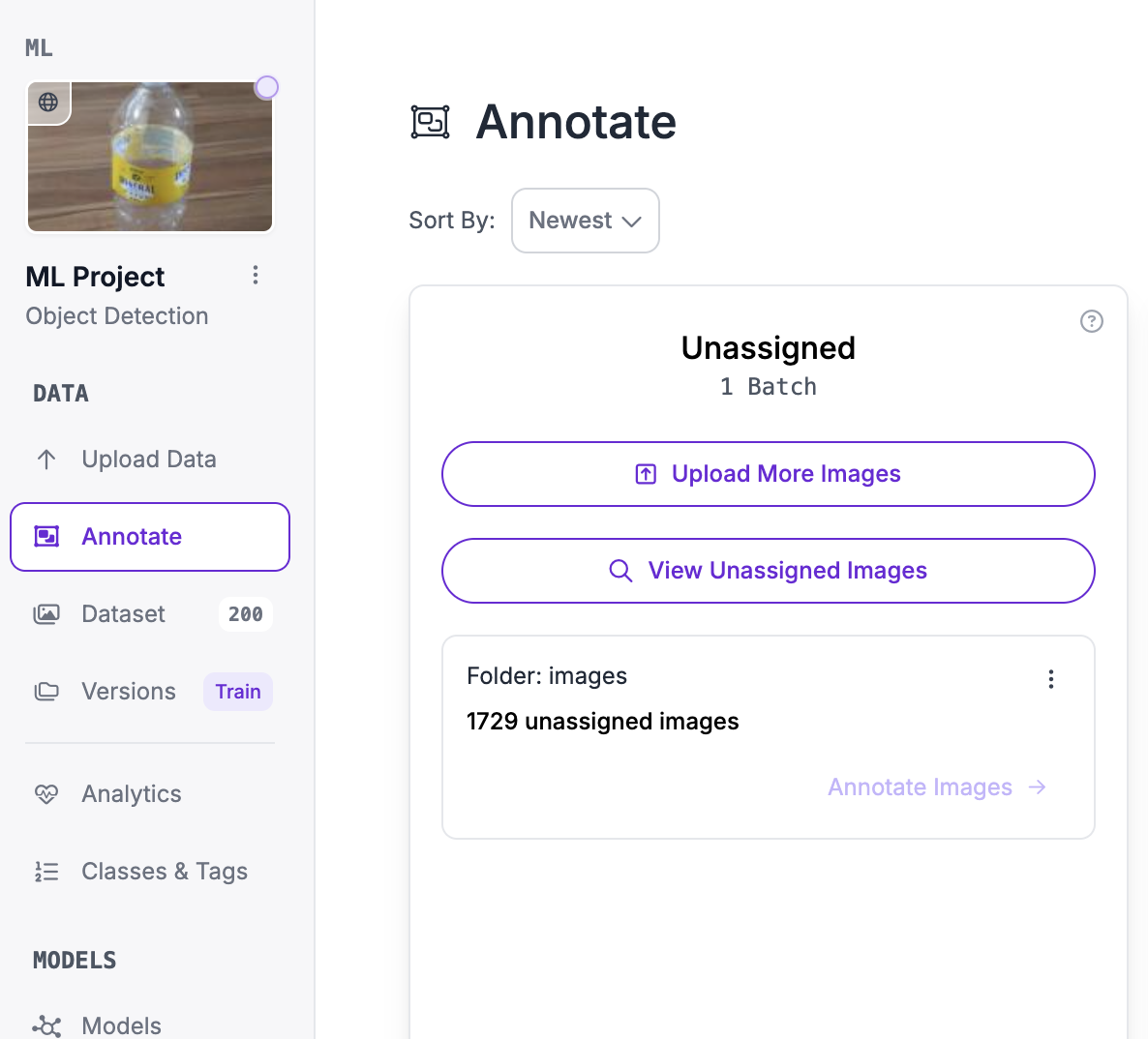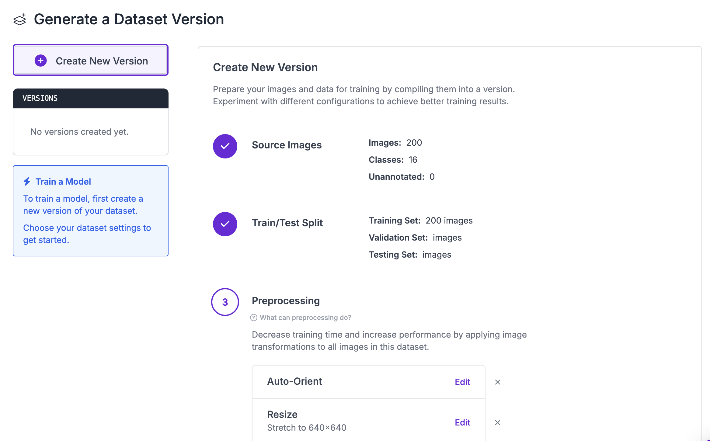 완료된 데이터들은 왼쪽에 Dataset 메뉴에서 확인할 수 있으며, 데이터 전처리 및 데이터 증강이 가능하다.