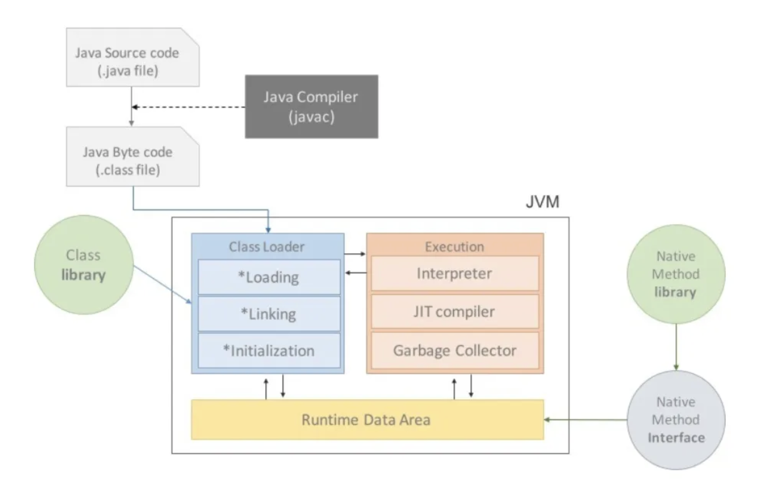- 자바 컴파일러가 생성한 바이트 코드를 읽어와 JVM 메모리에 저장