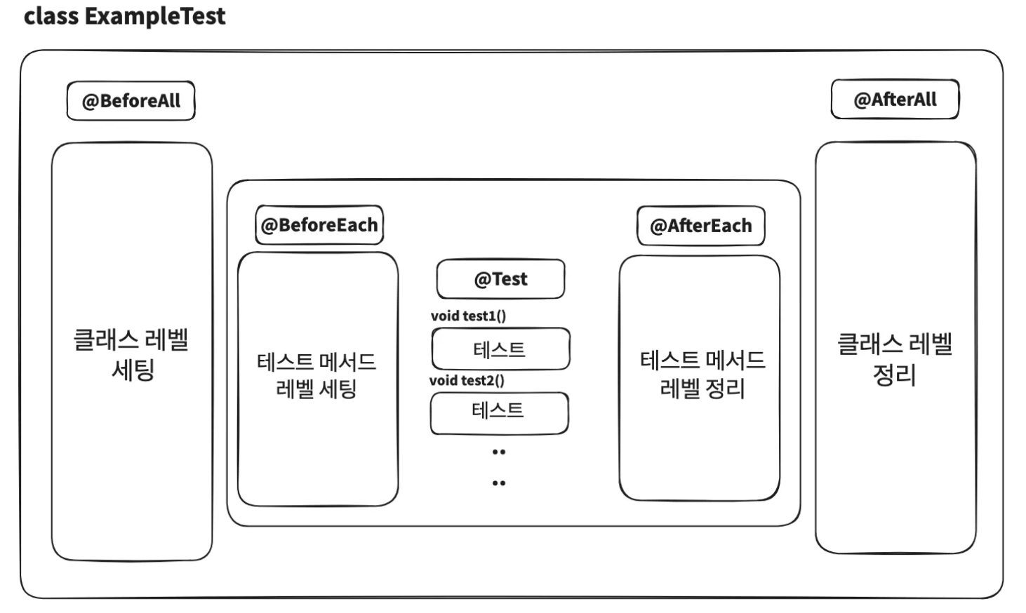 @BeforeEach@Test가 실행되기 직전에 항상 호출됨@Test@AfterEach@Test 메서드가 실행된 직후에 항상 호출 (테스트 성공/실패 여부 관계없이 실행됨)@BeforeEach에서 사용한 자원이나 데이터를 정리해 다음 테스츠에 영향을 주지 않도록클래스 레벨 정리 (1번만 실행)
