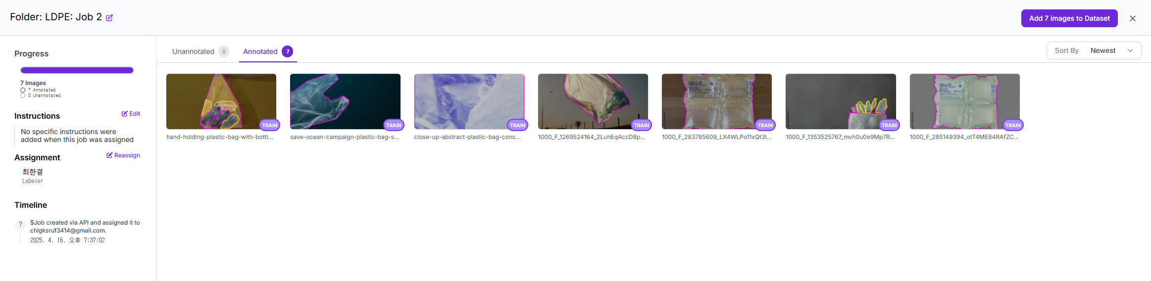 라벨링이 완료되면 밑의 사진과 같이 오른쪽 위에 Add to Dataset 버튼을 눌러준다.