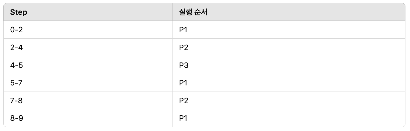 시간 할당량(Time Quantum)을 기준으로 프로세스를 순환하며 실행한다.