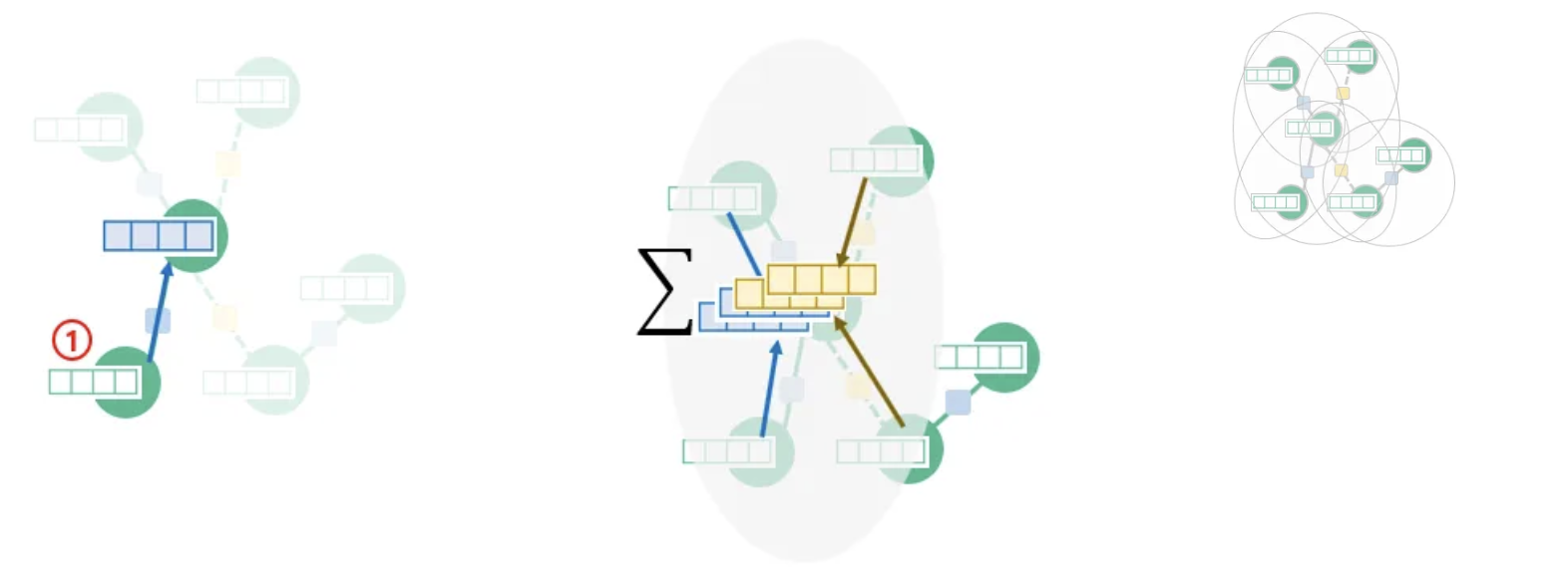 위 이미지처럼, 가운데 노드에 대해 가장 인접한 노드 ①에서 사용해 정보를 결합, 새로운 representation(파란색 블록으로 표시)을 생성할 수 있음.