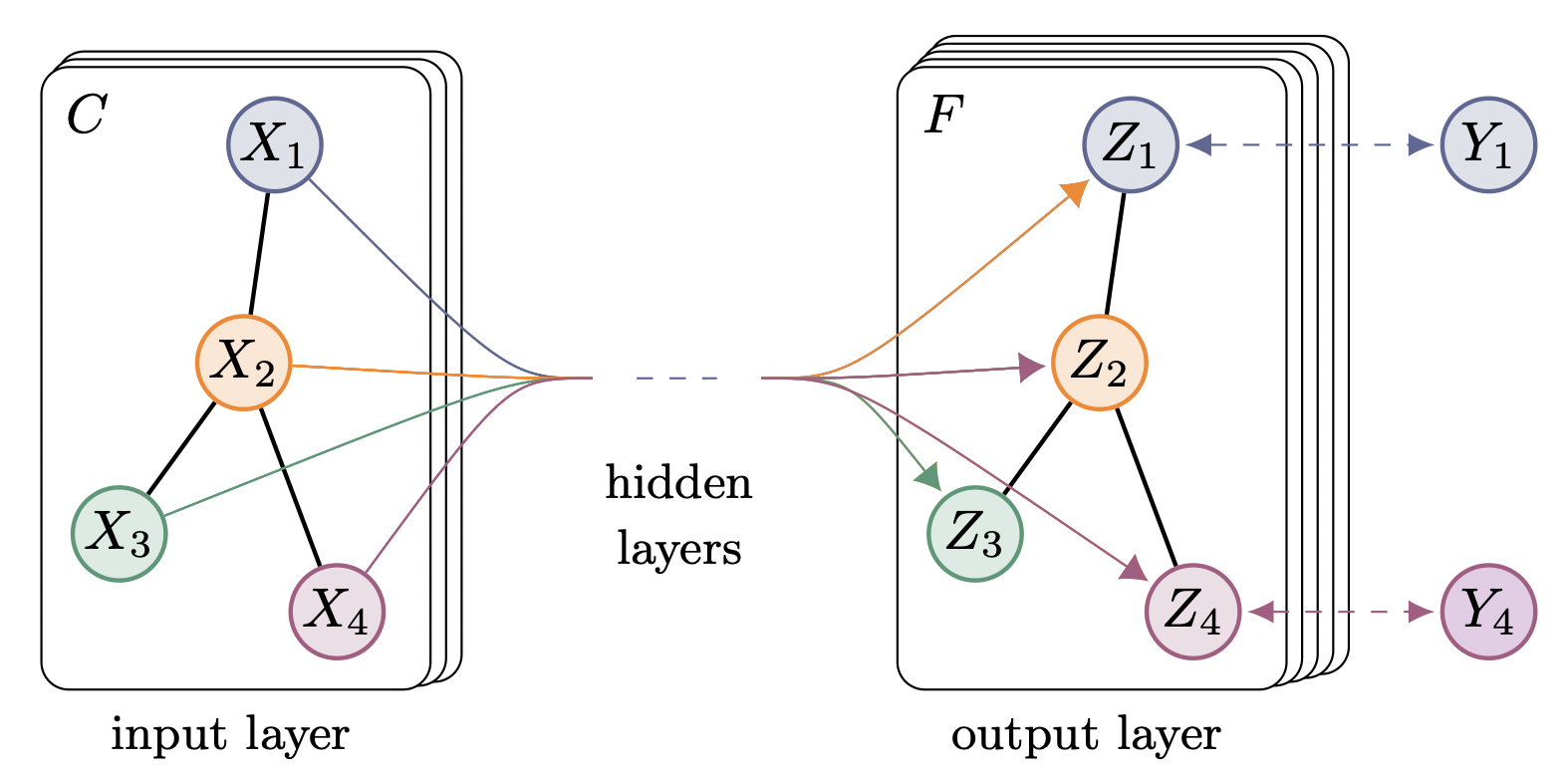 같은 방식으로 가장 인접한 4개의 노드에 대해 RNN을 적용하면 4개의 Hidden을 얻게 된다. 노드 사이의 순서를 고려하지 않는다면, 4개의 Hidden을 합해 가운데 노드에 대한 새로운 representation을 생성한다. 이렇게 생성된 representation은 한단계 인접해 있는 노드의 정보를 포함한 representation이 된다.