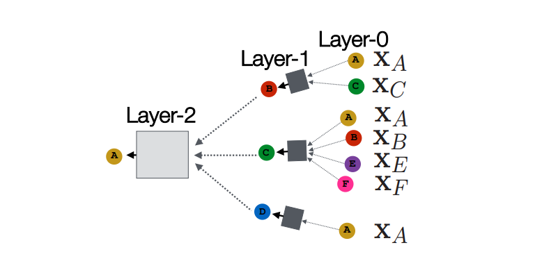 타겟 노드 A에서 이웃 노드인 B, C, D로부터 정보를 받고, 이웃 노드인 B, C, D는 이어서 그들의 이웃 노드로부터 정보를 받는다.