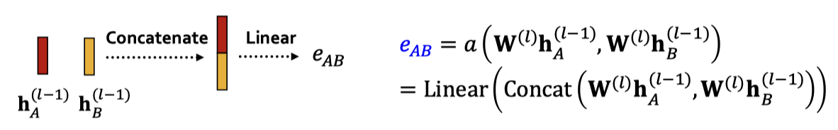 어텐션 매커니즘 의 를 계산하면, 노드쌍 의 메시지를 기반으로 어텐션 개수 를 계산한다. 이때 는 노드 로 가는 의 메시지 중요도를 말한다.