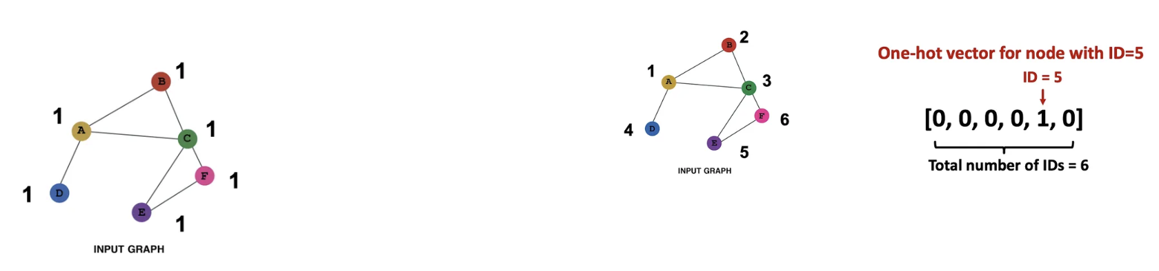 | 표현력 | 중간 수준, 모든 노드의 피처 값이 같지만 GNN은 여전히 그래프의 구조를 학습할 수 있음. | 높은 수준으로 각 노드가 고유의 ID를 갖고 있기 때문에 노드마다의 정보를 저장할 수 있음 |
