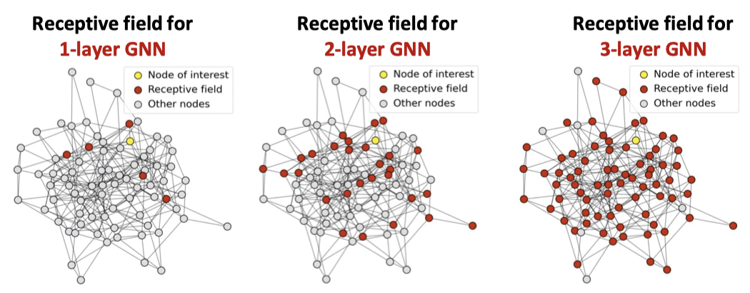 k개의 layer을 사용한 GNN 모델은 각 노드가 -hop neighborhood의 수용 영역(receptive field)을 가지게 되는데, 레이어가 많을 수록, 이 수용 영역은 넓어지게 되고, 임베딩은 수용 영역에 의해 결정됨. 즉, 층이 깊어질수록 수용 영역이 많이 겹치게 됨.