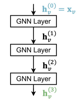 일반적으로 GNN을 구축할 때는 GNN 층을 순서대로 쌓는다. Input value로는 초기화한 노드 피처 를 받고, 개의 GNN 층을 거친 노드 임베딩 을 결과로 얻는다.